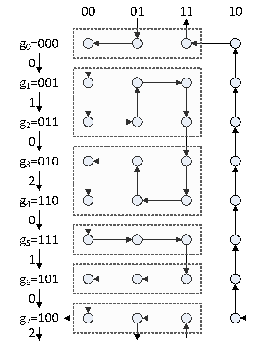 We will now show a construction for well-balanced binary Gray codes (following that of [3] and [6]) which allows us to generate a $n$-digit balanced Gray code for every $n$. The main principle is to inductively construct a $(n+2)$-digit Gray code $G'$ given an $n$-digit Gray code $G$ in such a way that the balanced property is preserved. To do this, we consider partitions of $G = g_0, \cdots, g_{2^n-1}$ into an even number $L$ of non-empty blocks of the form \[ \{g_0\}, \{g_1, \cdots, g_{k_2}\}, \{g_{k_2+1}, \cdots, g_{k_3}\}, \cdots, \{g_{k_{L-2}+1}, \cdots, g_{-2}\}, \{g_{-1}\} \] where $k_1 = 0$, $k_{L-1} = -2$, and $k_{L} = -1$ (mod $2^n$). This partition induces a $(n+2)$-digit Gray code in given by \[ \begin{aligned} & 00g_0, \\ & 00g_1, \cdots, 00g_{k_2}, 01g_{k_2}, \cdots, 01g_1, 11g_1, \cdots, 11g_{k_2}, \\ & 11g_{k_2+1}, \cdots, 11g_{k_3}, 01g_{k_3}, \cdots, 01g_{k_2+1}, 00g_{k_2+1}, \cdots, 00g_{k_3}, \cdots, \\ & 00g_{-2}, 00g_{-1}, 10g_{-1}, 10g_{-2}, \cdots, 10g_0, 11g_0, 11g_{-1}, 01g_{-1}, 01g_0 \end{aligned} \] This process can be more easily visualized in Figure 2, where the 3-digit Gray code defined by the transition sequence 01020102 is extended to a 5-digit code using the partition $\{g_0\}, \{g_1, g_2\}, \{g_3, g_4\}, \{g_5\}, \{g_6\}, \{g_7\}$. The reason for the “notch” in the first and last rows is so that the transition between $g_0$ and $g_{-1}$ is included in the new Gray code.