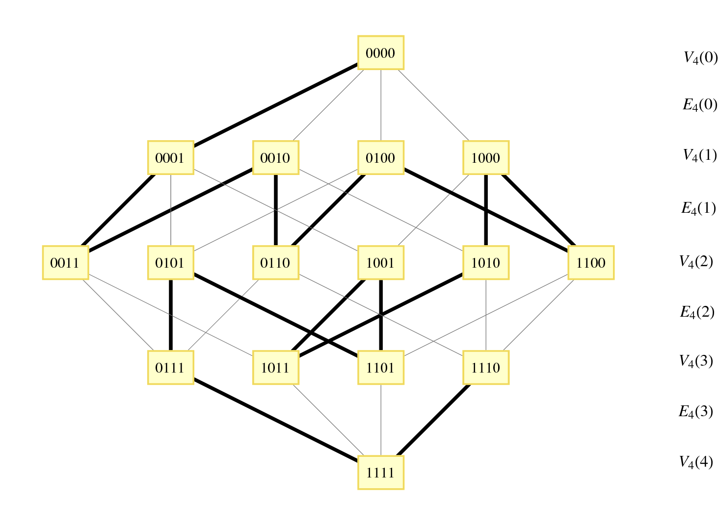 We can formalize the concept of monotone Gray codes as follows: consider the partition of the hypercube $Q_n = (V_n, E_n)$ into levels of vertices that have equal weight, i.e. \[ V_n(i) = \{ v \in V_n : v \text{ has weight } i \} \] for $0 \leq i \leq n$. These levels satisfy $|V_n(i)| = \binom{n}{i}$. Let $Q_n(i)$ be the subgraph of $Q_n$ induced by $V_n(i) \cup V_n(i+1)$, and let $E_n(i)$ be the edges in $Q_n(i)$. A monotonic Gray code is then a Hamiltonian path in $Q_n$ such that whenever $\delta_1 \in E_n(i)$ comes before $\delta_2 \in E_n(j)$ in the path, then $i \leq j$. Such a code when $n = 4$ is shown in Figure 4.