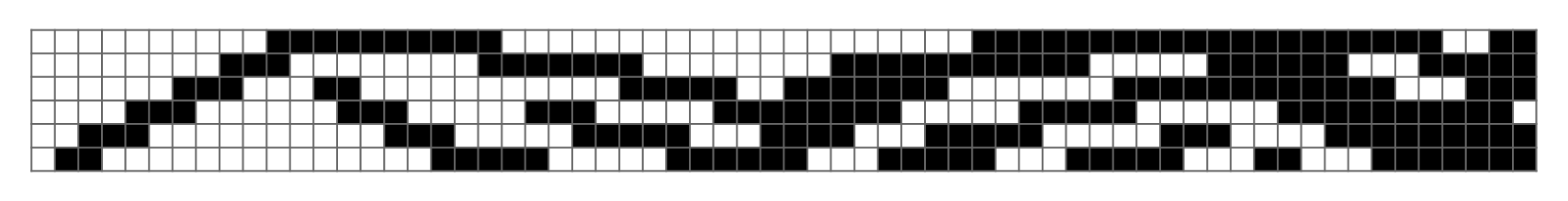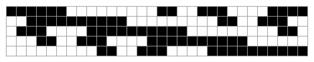 Another way of balancing Gray codes is to maximize the distance between consecutive changes of digits in the same position. That is, we would like to find a $n$-digit Gray code $G$ with transition sequence $(\delta_k)$ such that the minimum run length of $G$ \[ \text{mrl}(G) = \min \{ |i-j| : \delta_i = \delta_j, i \neq j \} \] is maximal over all $n$-digit Gray codes. As an example, the minimum run length for every binary reflected Gray code is $\text{mrl}(BRGC) = 2$, since the bit in position 0 changes at every two steps. A 5-digit Gray code which has a minimum run length of 4 is shown in Figure 3.